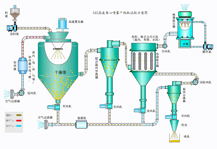 離心噴霧干燥塔具有良好的均勻度、流動性和溶解性,產(chǎn)品純度高,質(zhì)量好,生產(chǎn)過程簡化,操作控制方便,料液經(jīng)塔體頂部的高速離心霧化器,(旋轉(zhuǎn))噴霧成細微的霧狀液珠,與熱空氣并流接觸在短的時間內(nèi)可干燥為成品,特殊設(shè)備將液料噴成霧狀,使其與熱空氣接觸而干燥。噴霧干燥機空氣經(jīng)過濾和加熱,進入干燥器頂部空氣分配器,熱空氣呈螺旋狀均勻地進入干燥室,在熱風氣流中,可蒸發(fā)95%-98%的水份,完成干燥時間僅需數(shù)秒鐘,特別適用于熱敏性物料的干燥。